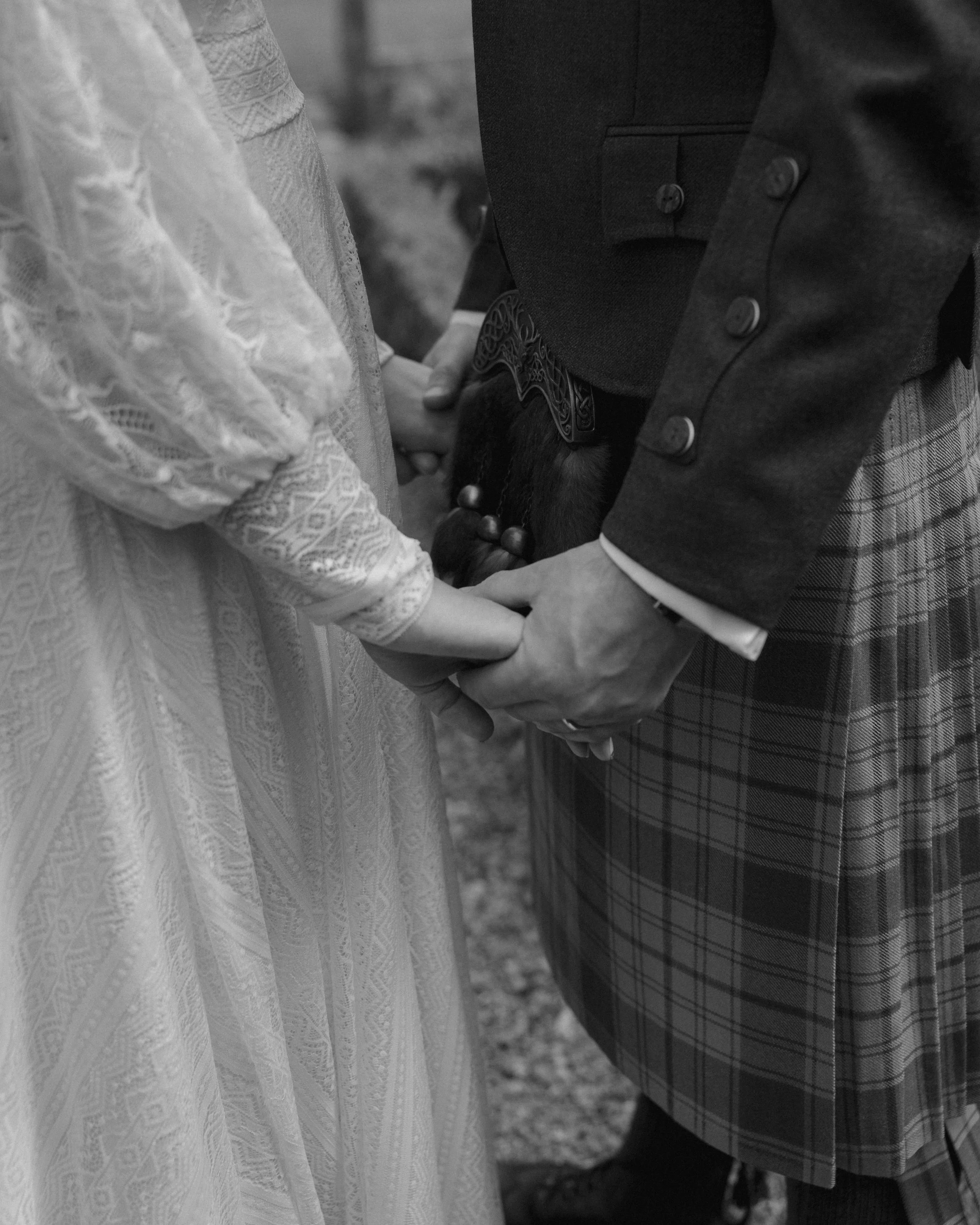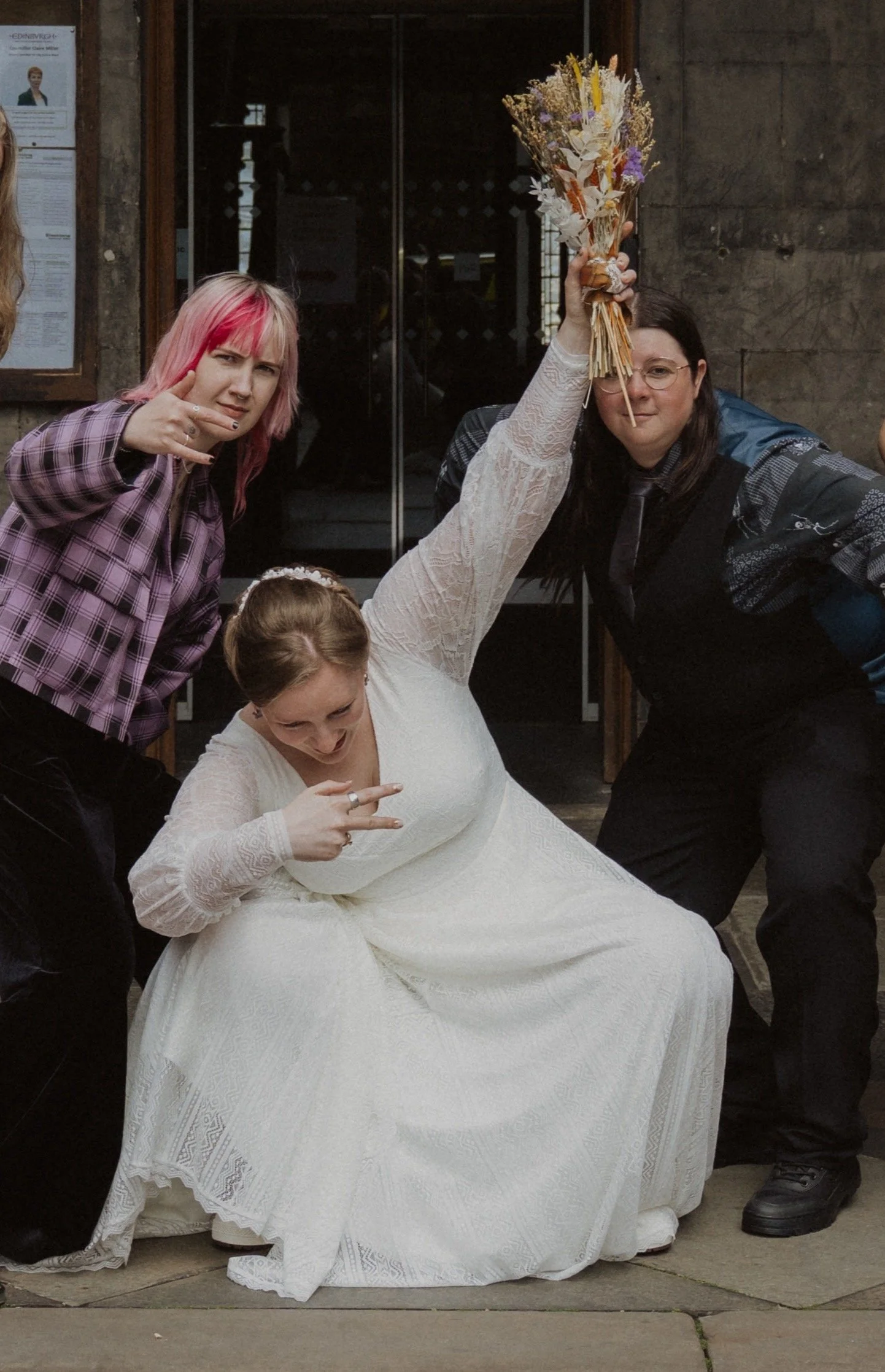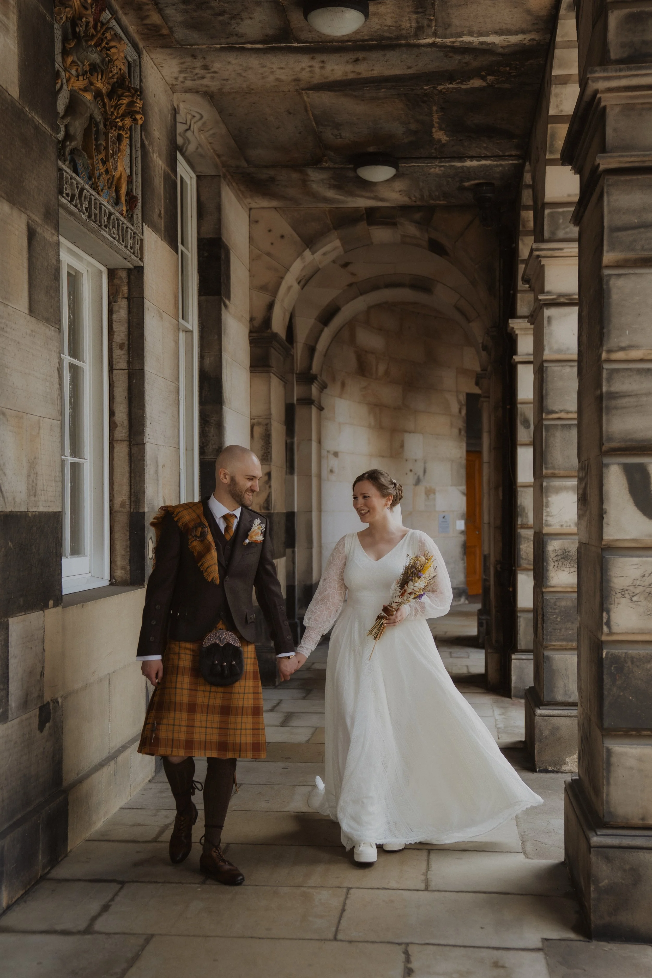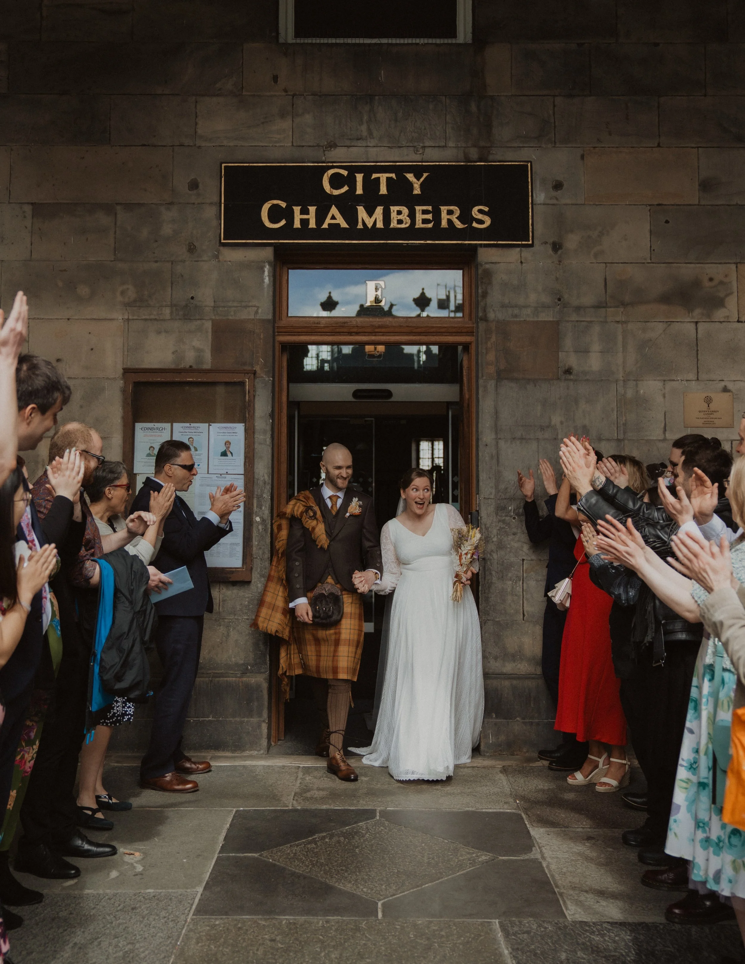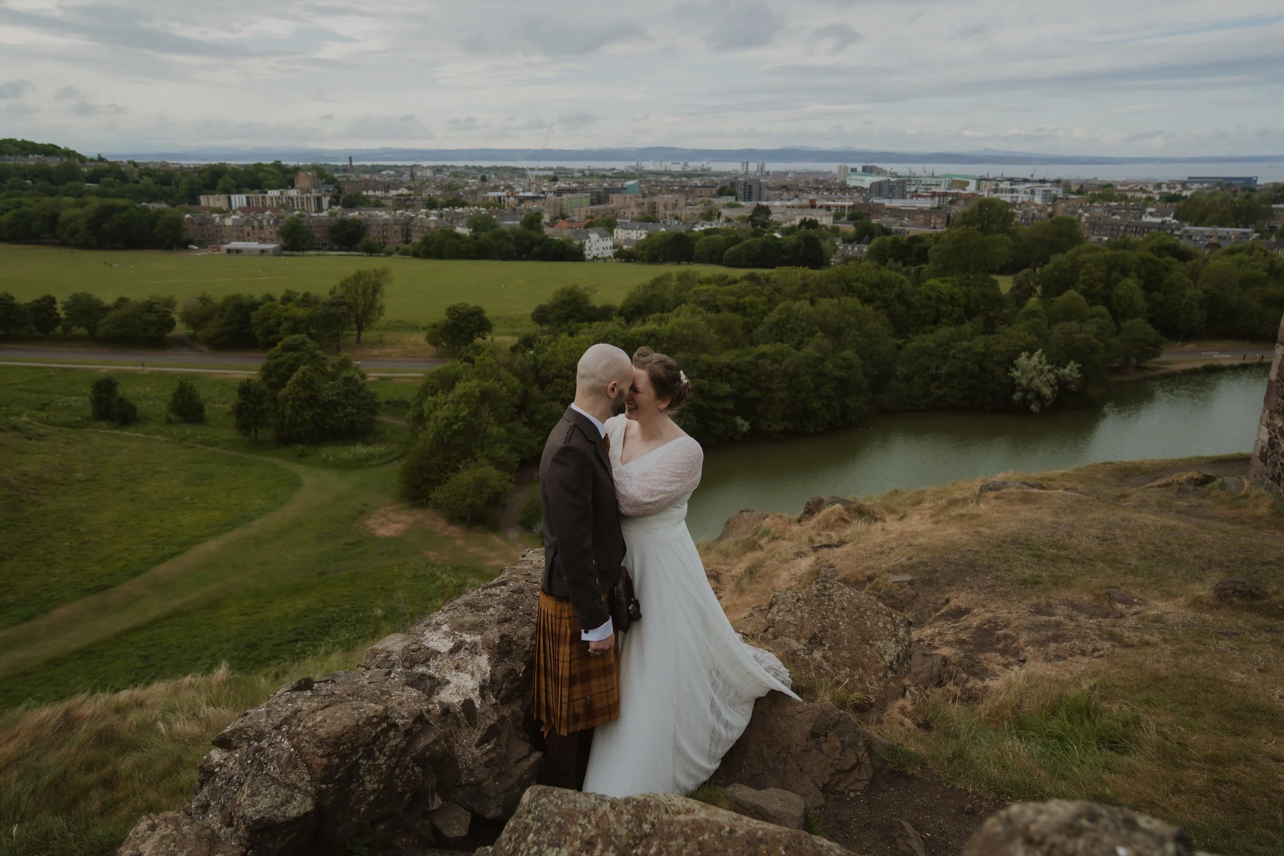 Me and Alastair have always been team elopement since we first talked about marriage - neither of us wanted to have a massive wedding and often joked about taking off up a mountain in full gown and kilt with a photographer and celebrant - but we decided on a small, intimate wedding when we found out that his mum’s cancer had come back. She very sadly passed away before we had started properly planning, and after the funeral we decided to go ahead with planning to have something positive to pour ourselves into. The vibe very much became “We’re ‘eloping’ but you are the elite who are invited to join us for the party” with our closest family and friends attending. We did a hand fastening ceremony at Edinburgh City Chambers, followed by a reception at the local BrewDog (where my husband works) and a small hike part way up Arthur’s Seat to the Ruined Chapel of St Anthony. While it was forecast to rain like stair-rods, we got glorious sunshine all day; and it was such a fun day walking around Edinburgh together looking all fancy!