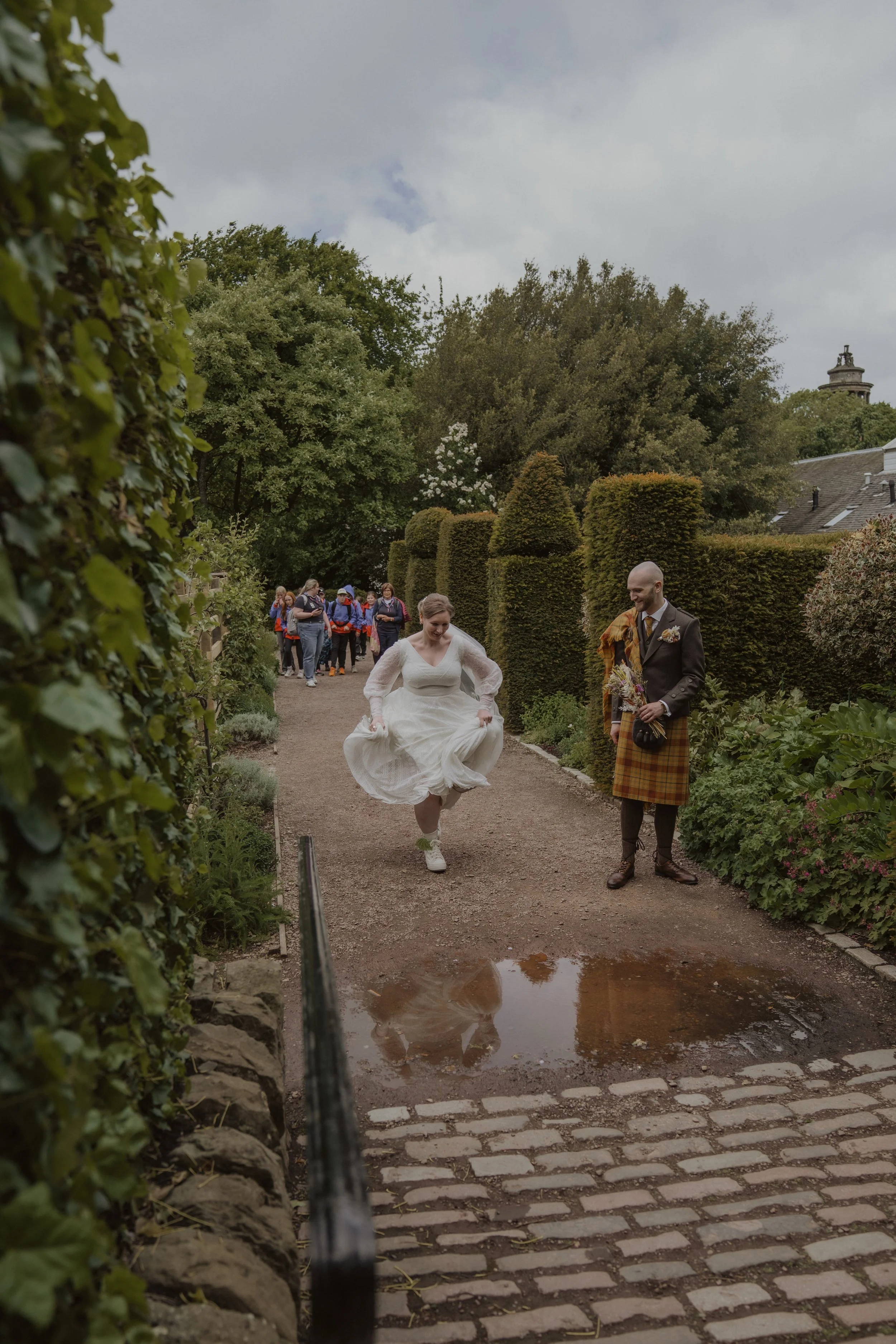 It’s very hard to choose as our photographer was so wonderful and we love many photos for different reasons; but we both loved this black and white one of us together. Lizzie took us to a hidden garden area in the heart of the Royal Mile, and the wind was playing the perfect maid of honour with the veil toss haha! Me and Alastair are constantly making each other laugh and this more traditional shot was taken before I decided to jump the puddle on the way out (made it over without a splash!)
